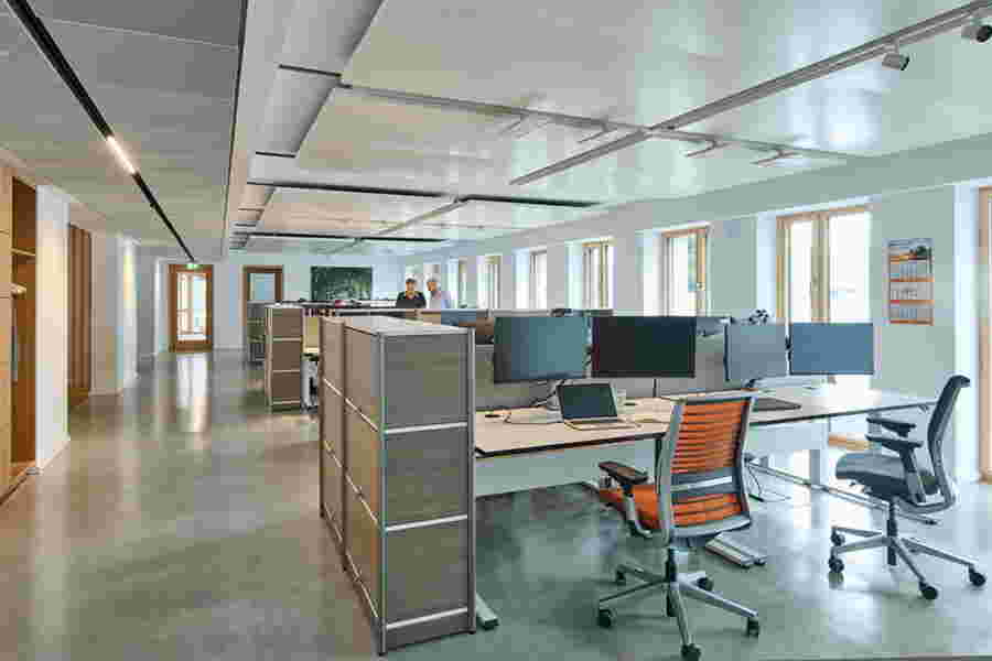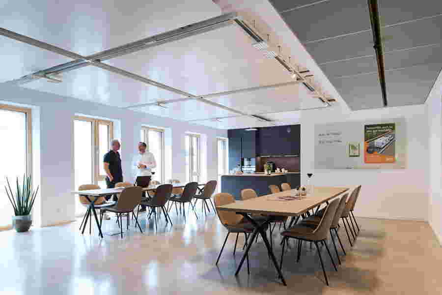 Selbstverständlich ist auch die erste eigene Immobilie des ACV „klimafair“ entwickelt, wie es im Markenclaim versprochen wird. Anstatt neue Flächen zu versiegeln, wählte der Club eine Bestandsimmobilie, bei Materialien, Energieversorgung und Mobiliar standen Nachhaltigkeit und CO₂-Bilanz im Fokus. Drei Viertel des Strombedarfs des Gebäudes werden voraussichtlich über die eigene Photovoltaikanlage auf dem Dach erzeugt, auch die acht Ladeplätze für E-Autos der Mitarbeiter und Besucher werden mit Sonnenstrom versorgt. Moderne Kühl- und Heizsegel ermöglichen eine energiesparende Klimatisierung der Räumlichkeiten.