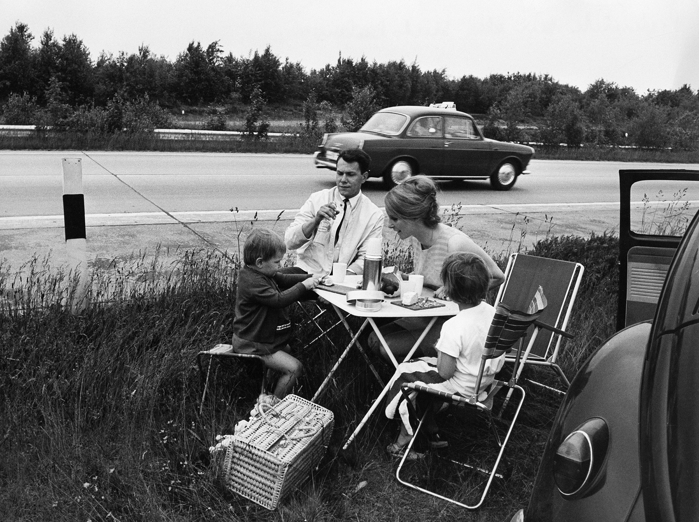Nicht zu empfehlen für die Picknick-Pause: Unterwegs mit dem Käfer hielt diese Familie offenbar einfach am Fahrbahnrand an.